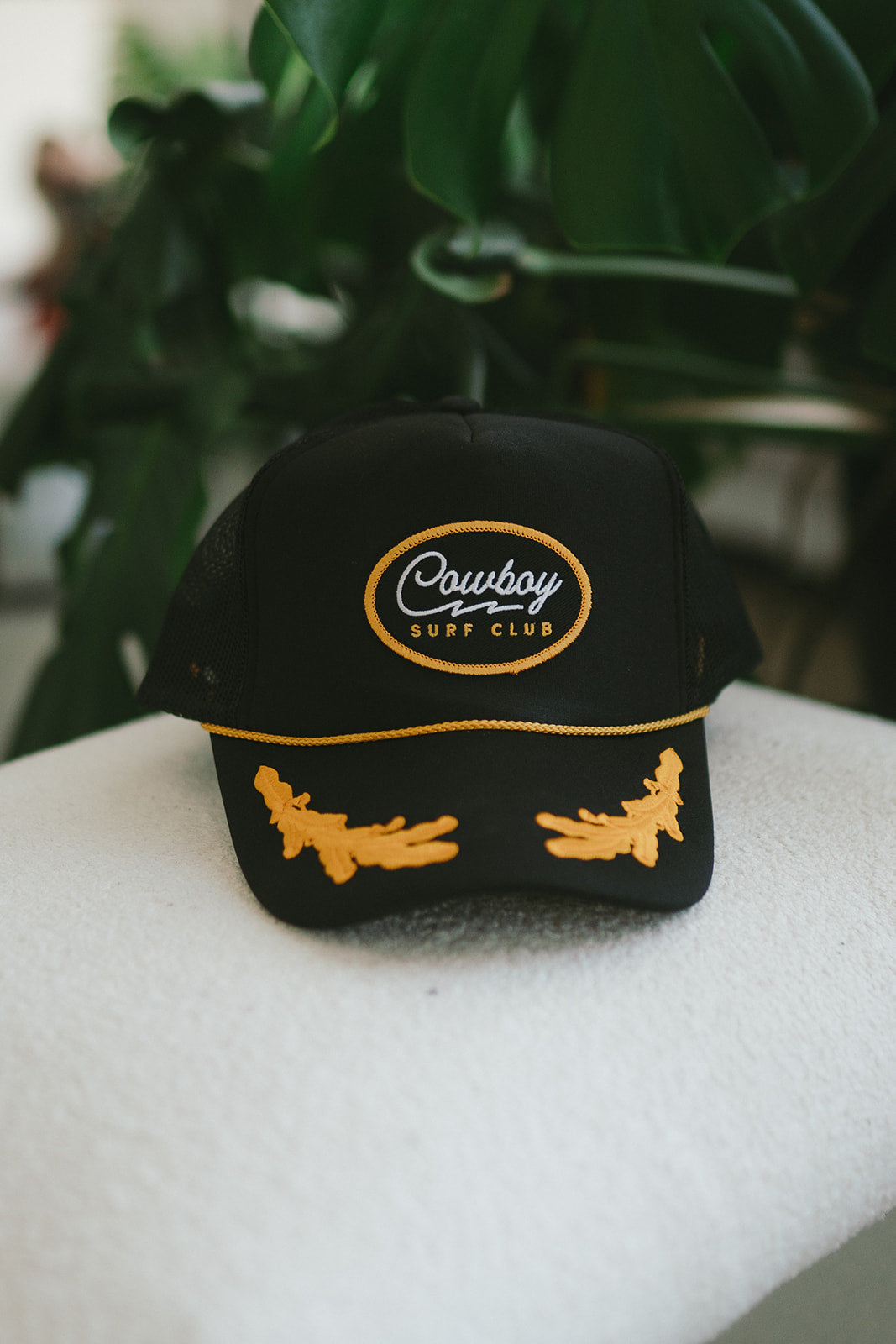 Embrace the laid-back coastal vibe with our Cowboy surf hat. Crafted for beach lovers, it features a classic trucker design with gold embellishment. Its adjustable snapback ensures a comfortable fit for all. Enjoy the sun-soaked afterglow in style and shade with this essential beach accessory.